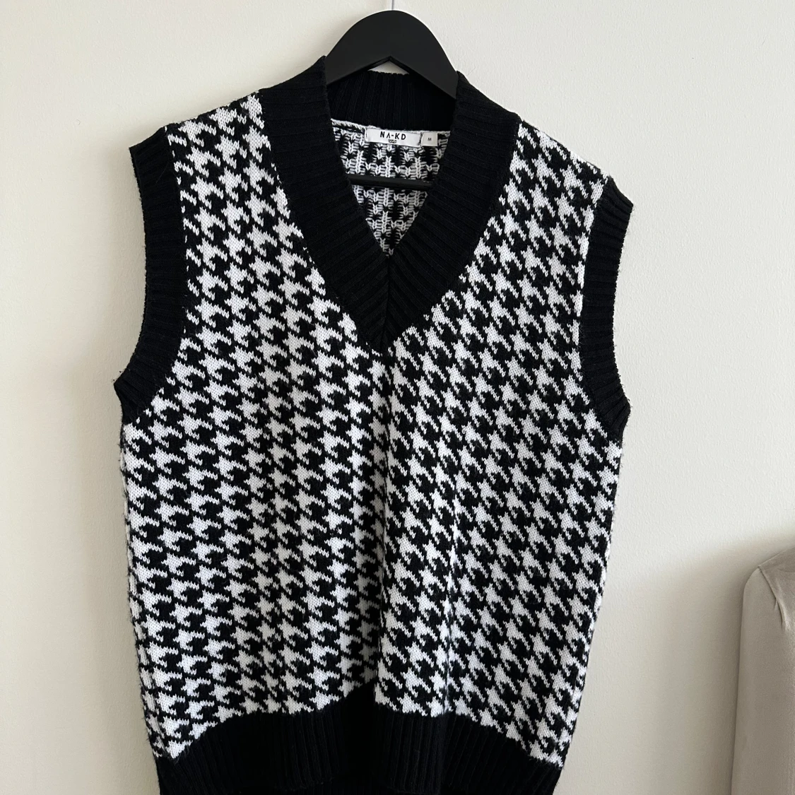 En hundtandsmönstrad stickad väst i storlek M men passar S-L beroende på hur man vill att den ska sitta