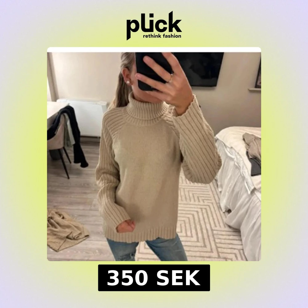 Det är inte mina bilder!! Säljer en beige polotröja med ribbade, långärmade ärmar och hög krage. Tröjan är stickad och har en relaxed passform som är både snygg och bekväm. Perfekt att matcha med jeans för en chill look.