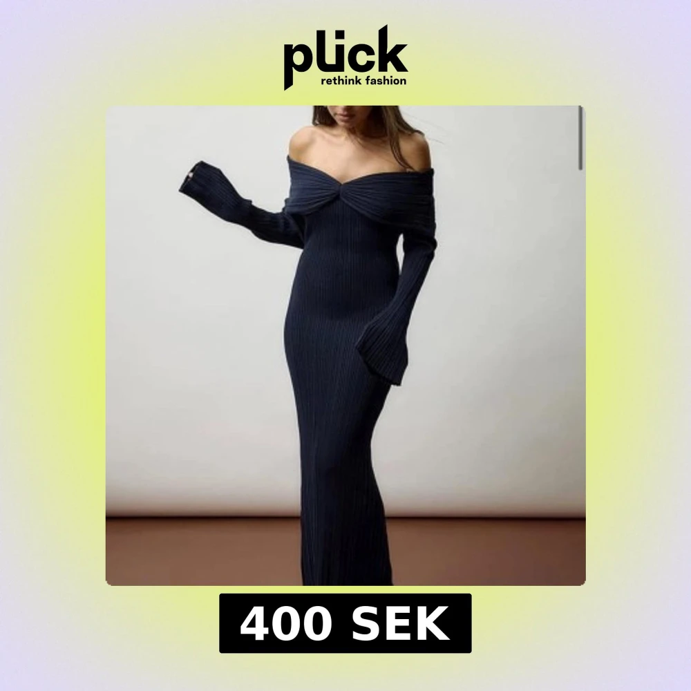 Lång, mörkblå, ribbad klänning från NAKD. Offshoulder. Ny med prislapp. Är storlek xs.