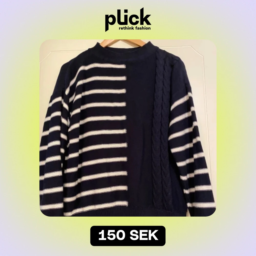 Somrig Marinblå och vit stickad tröja i kabelstickad på halva och randig andra halvan . Passa strö XS-M beroende på hur oversized man föredrar