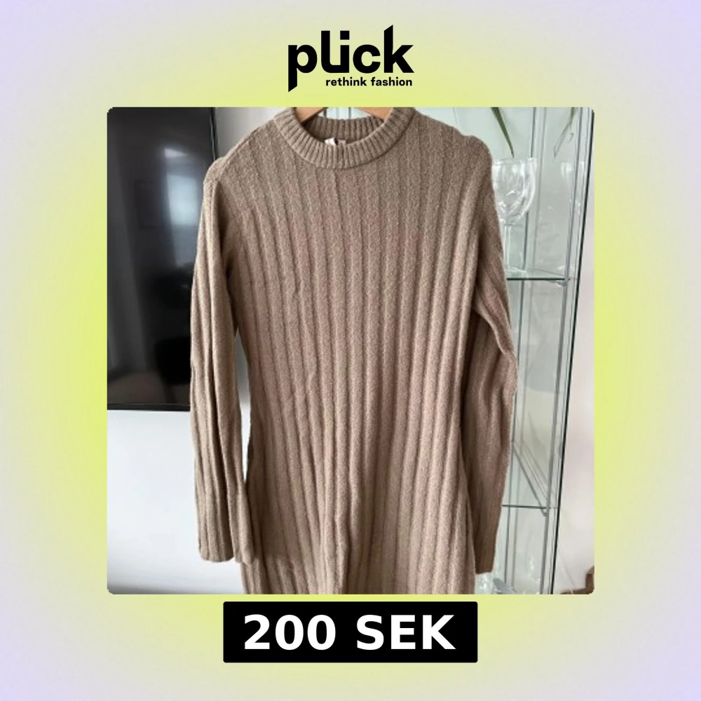 Säljer en beige ribbstickad klänning med lång ärm och rund halsringning. Klänningen har en rak passform och är perfekt för kyligare dagar. Enkel och stilren design som passar till många tillfällen.