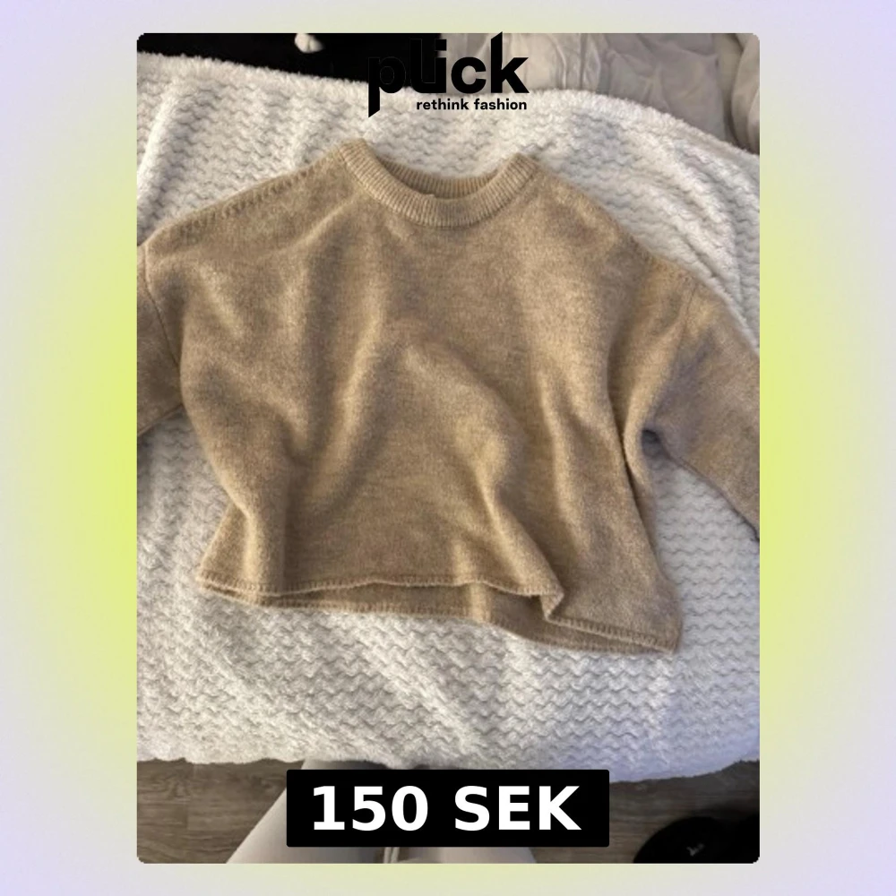 Beige croppad stickad tröja med rund hals och långa ärmar. Tröjan har en enkel, avslappnad passform och ribbstickad kant vid halsen.