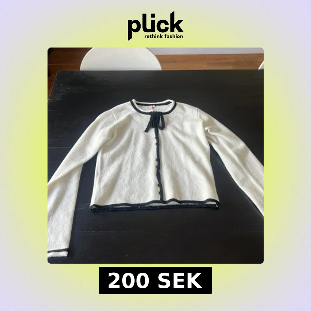Vit kofta från Nelly i stickat material, med svarta kanter, knappar framtill och en rosett vid halsen. Använd en gång.