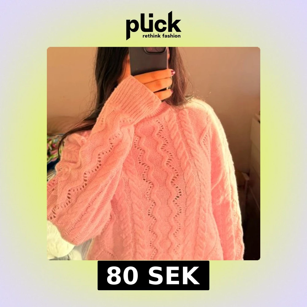 Mysig rosa stickad tröja med kabelstickat mönster. Perfekt för kyliga dagar med sin varma och bekväma design. Tröjan har långa ärmar och en hög krage som ger extra värme.