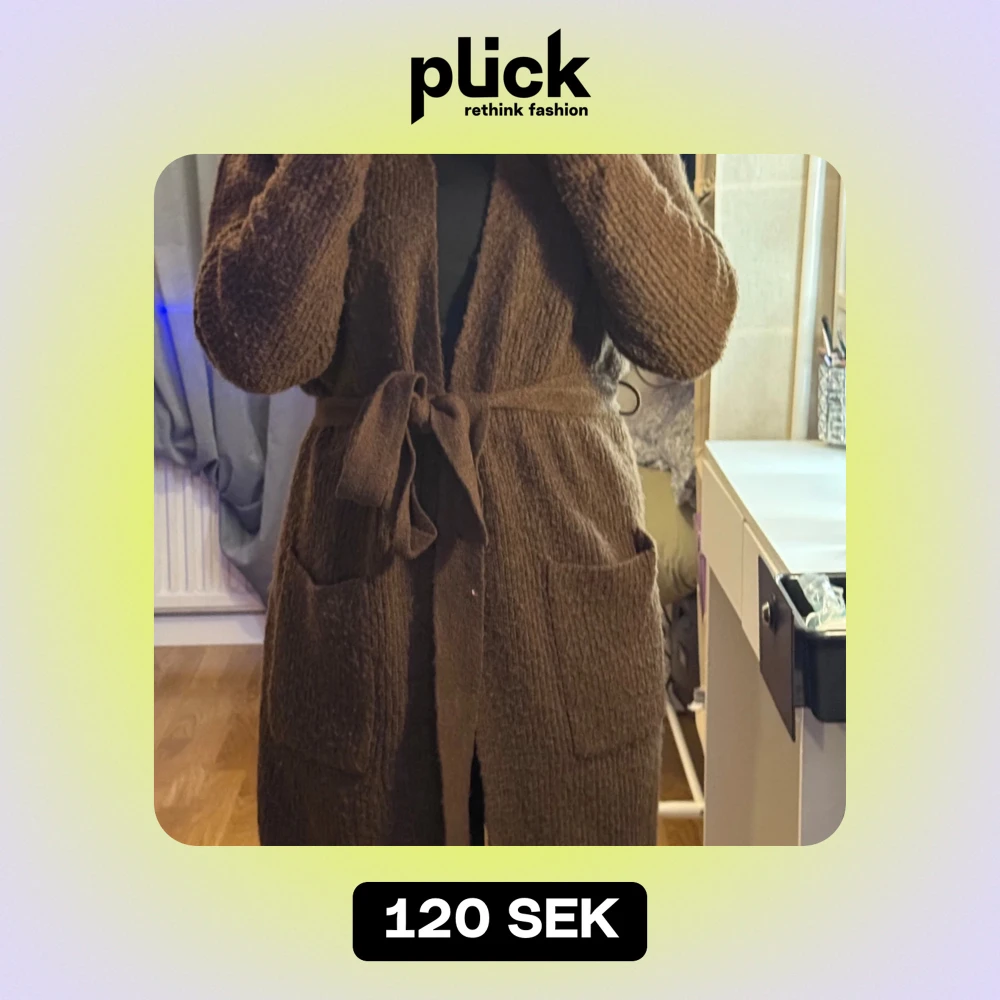 Mysig brun stickad kappa med knytband i midjan. Perfekt för höst och vinter, den har långa ärmar och en skön, varm känsla. Passar bra för en avslappnad stil och håller dig varm under kyliga dagar.