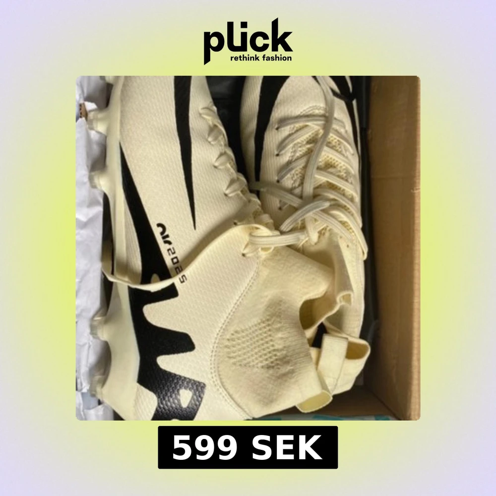 Snygga fotbollsskor i beige med svarta detaljer och coolt Air 2025-tryck på sidan. Skorna har snörning, stickad ovandel och plös med dragflik för enkel påtagning. Perfekta för dig som vill sticka ut på planen.