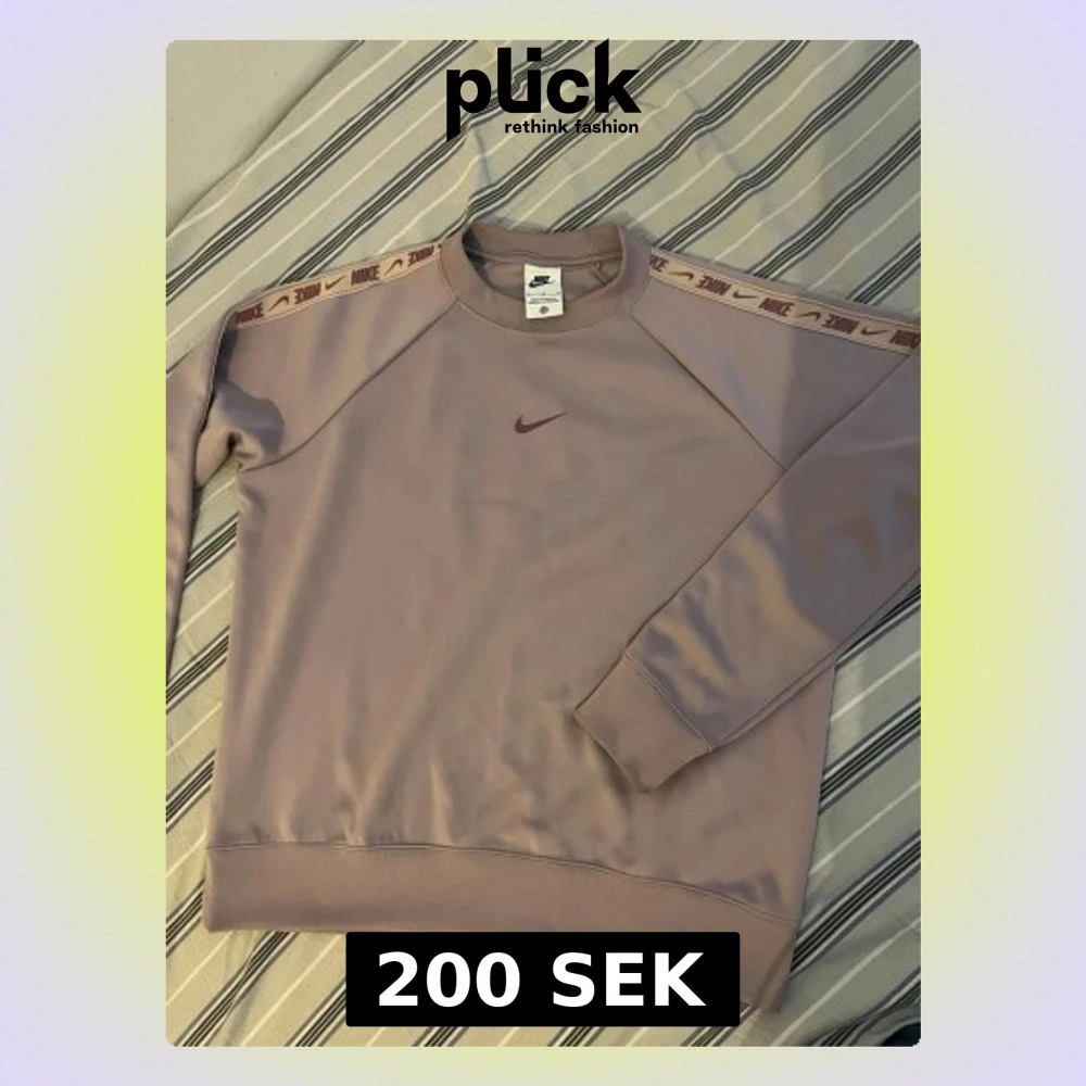 Säljer en ljuslila sweatshirt från Nike med vinröd swoosh på bröstet och dekorativa band med Nike-logga längs ärmarna. Tröjan har rund hals, ribbade muddar och är tillverkad i mjukt material. Perfekt för en avslappnad och sportig stil.