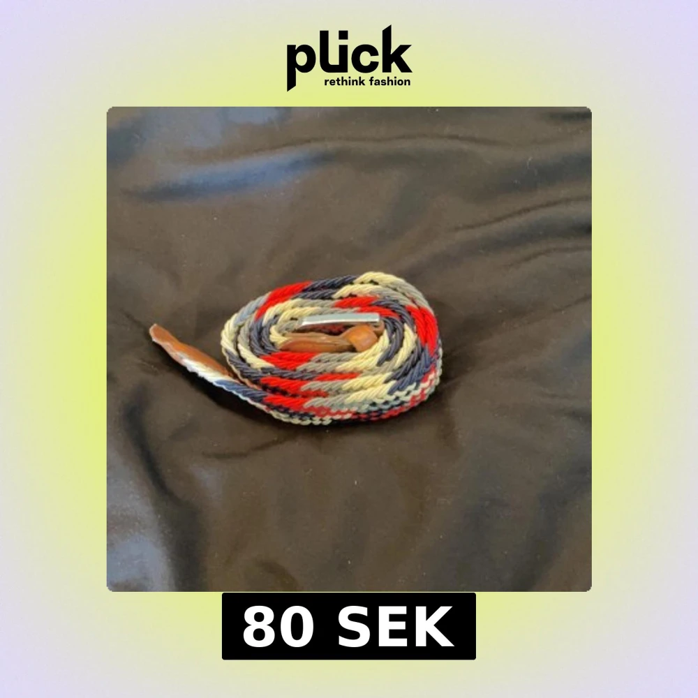 Säljer ett snyggt flätat bälte i rött, marinblått och beige med coola läderdetaljer vid spännet. Bältet har ett randigt mönster och är gjort i ett mjukt, stickat material som ger en avslappnad vibe. Perfekt för att lyfta vilken outfit som helst!
