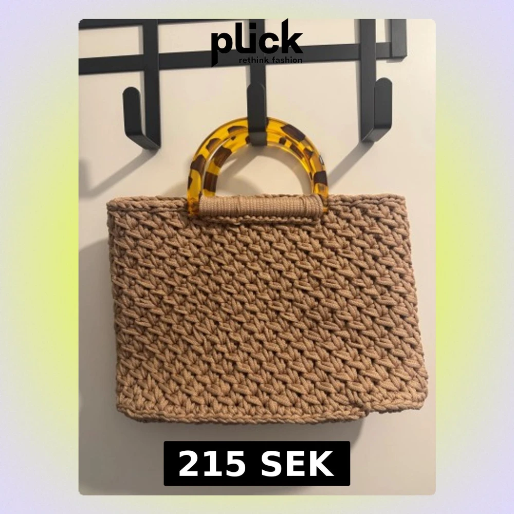 Snygg beige handväska, handgjord virkad look och ett unikt handtag i transparent gul plast med leopardmönster. Väskan har en rektangulär form och är perfekt för dig som gillar trendiga detaljer och naturfärger.