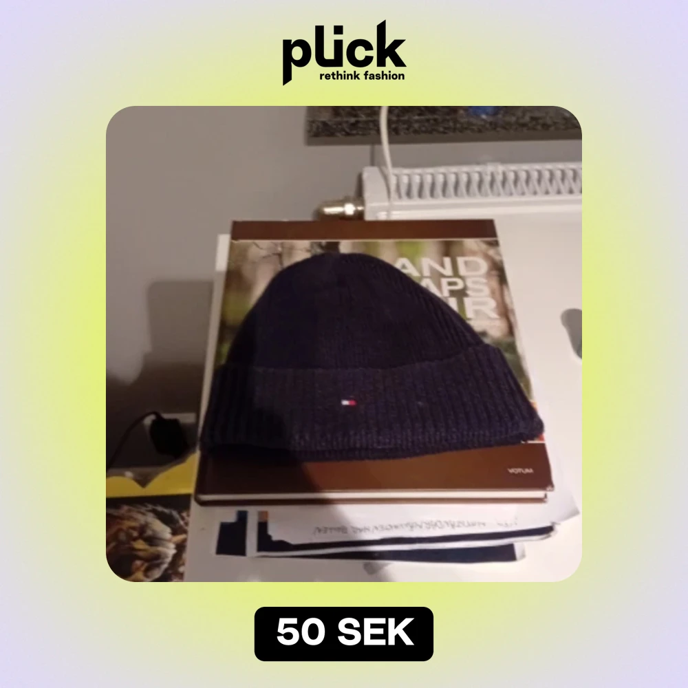 Säljer en snygg mörkblå stickad mössa med en liten broderad logga framtill. Perfekt för kyliga dagar och ger en stilren look. Mössan är i bra skick och passar de flesta huvudstorlekar. Ett måste för höst- och vintergarderoben!