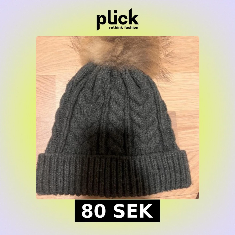 Snygg mörkgrå kabelstickad mössa från Sense med bred ribbad kant och en fluffig brun pälsboll på toppen. Perfekt för kalla dagar, mössan är gjord i mjuk ull och har ett trendigt flätmönster som ger extra stilpoäng.