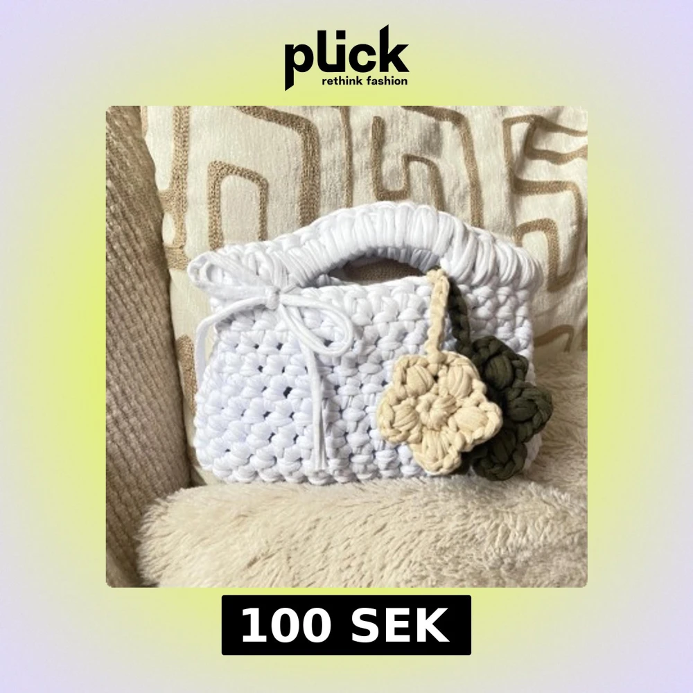 Superfin handvirkad vit handväska med tjockt garn och handtag. Väskan har en söt knytrosett och två virkade blommor i beige och olivgrönt som dekoration. Perfekt accessoar för att lyfta din outfit.