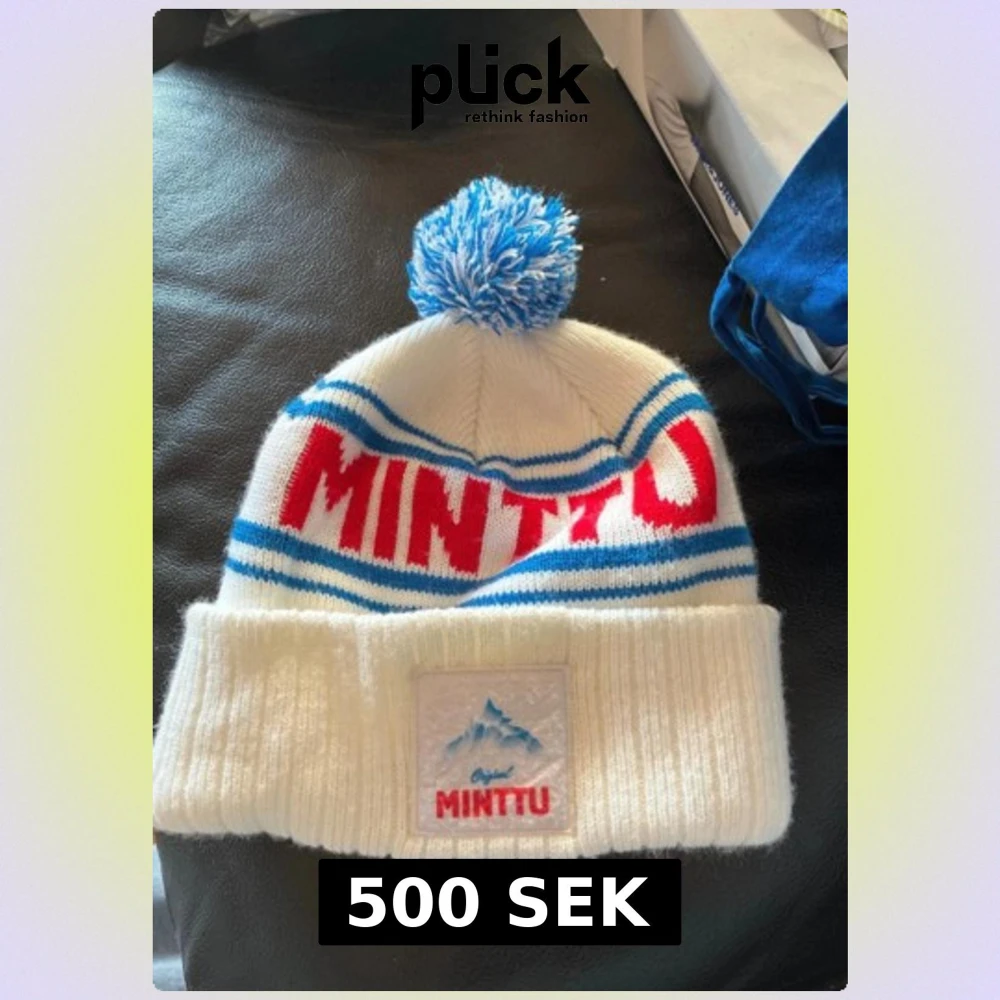 Säljer en vit stickad Minttu mössa med blå och röda detaljer, samt en stor blåvit tofs på toppen. Mössan har bred uppvikt kant med Minttu-logga framtill och blå ränder runt om. Perfekt för kalla dagar och snygg att ha på vintern.
