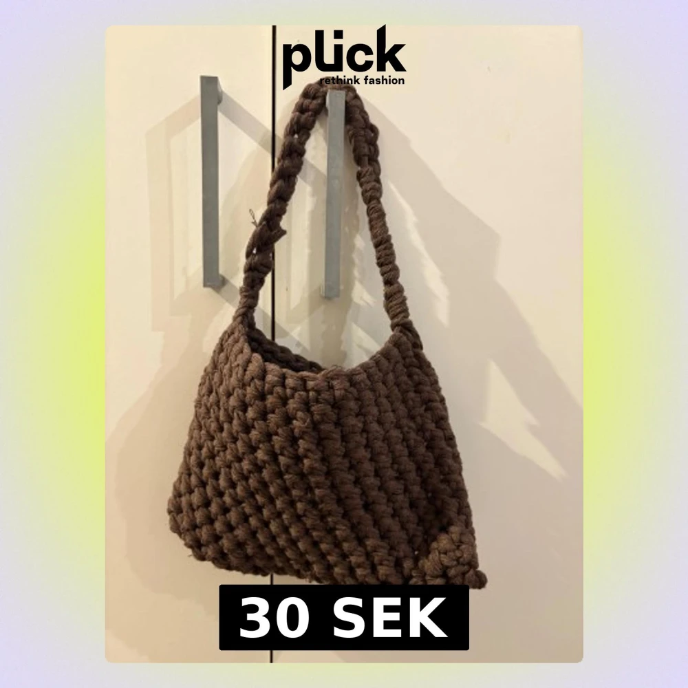 Säljer en brun virkad axelväska. Väskan har en mjuk och chunky look, perfekt för dig som gillar handgjorda accessoarer. Materialet är mjukt och ger en cool, unik vibe till din outfit. Lite fransig i handtaget.