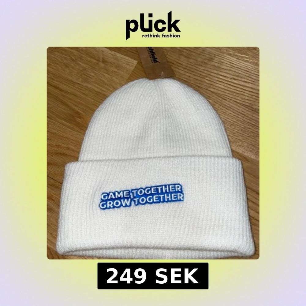 Vit mössa från Beechfield med uppvikt kant och blå broderad text 'GAME TOGETHER GROW TOGETHER' framtill. Perfekt för kalla dagar och enkel att matcha med olika outfits. Presentkort ingår vid köp, Värde 59kr!