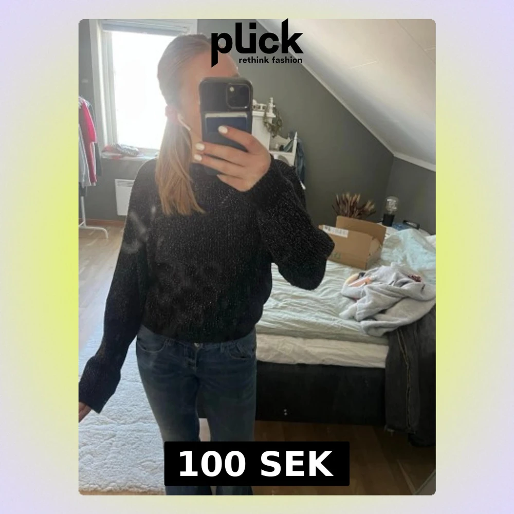 Säljer en svart stickad tröja med diskret glittereffekt. Tröjan har en avslappnad passform, långa ärmar och rund halsringning. Perfekt för dig som vill ha något enkelt men ändå lite extra. Passar till både jeans och kjol.