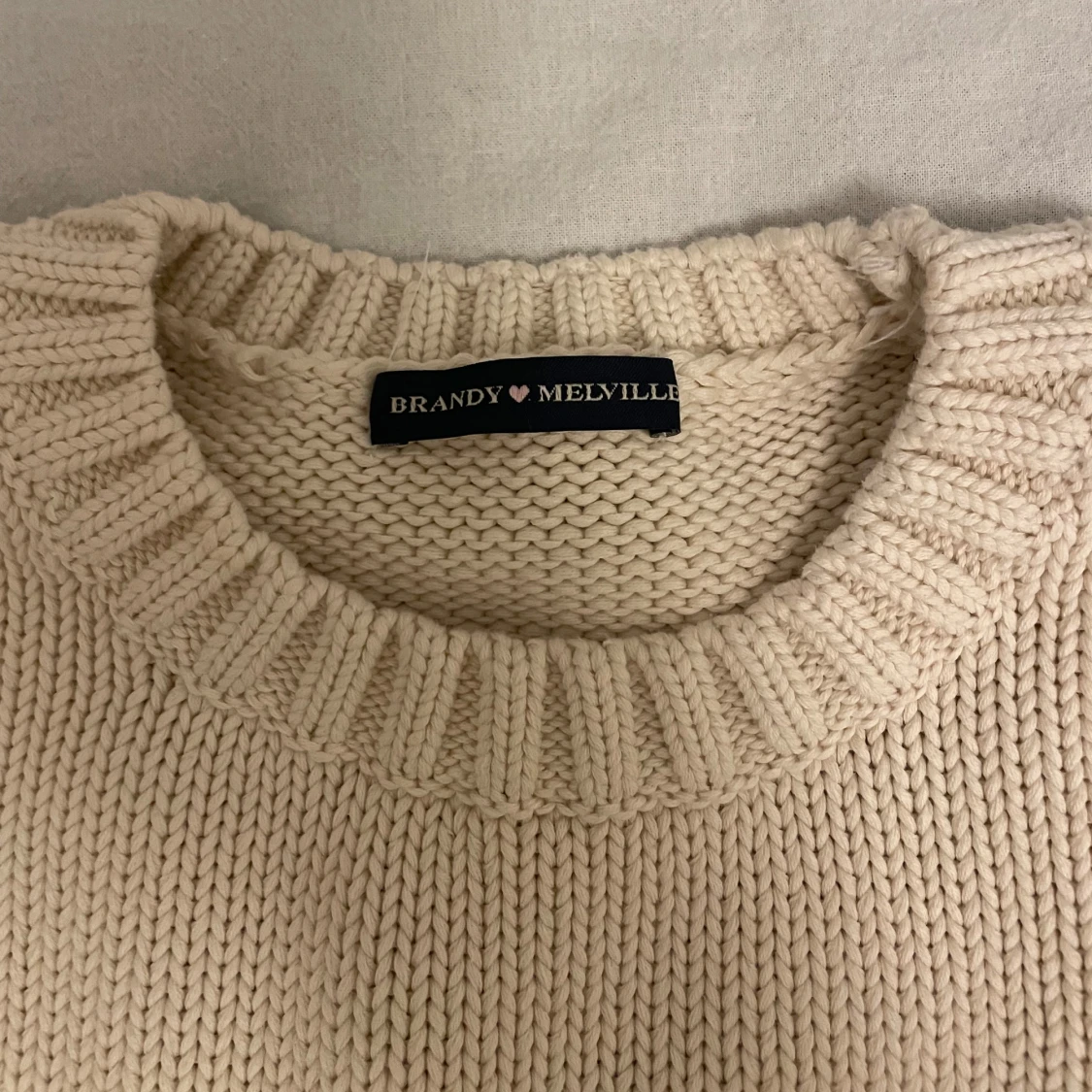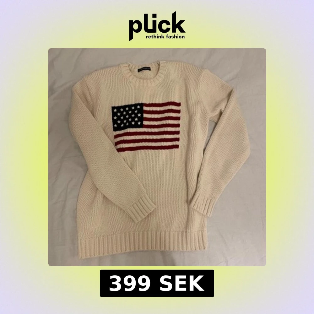 Säljer en vit stickad tröja från Brandy Melville med amerikanska flaggan på framsidan. Tröjan har långa ärmar och ribbstickade detaljer vid hals, ärmslut och nederkant. Använd en gång, tröjan är alltså i nyskick. Säljer pga den är för stor för mig.