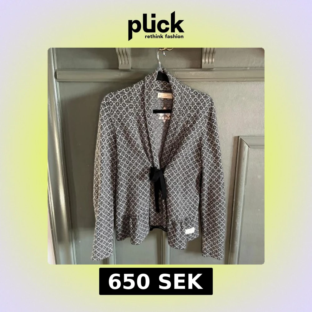 Snygg stickad kofta med knytdetalj fram. Svart vitt mönster och med lite volang i nederkant.