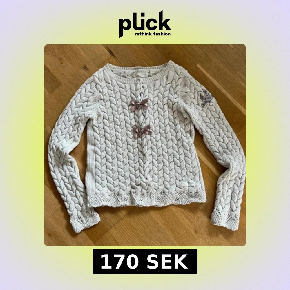 Superfin beige stickad tröja från Odd Molly med grovt flätmönster, två söta rosetter framtill och broderad logga på ärmen. Tröjan har lång ärm och rund halsringning, samt fina virkade detaljer vid nederkanten. Perfekt för dig som gillar unika detaljer!