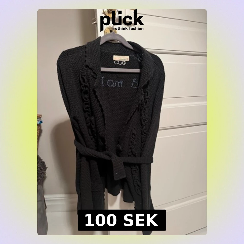 Svart stickad kofta från Odd Molly med broderad logga på ryggen och fina virkade detaljer längs kanterna. Koftan har bälte i midjan och långa ärmar. Perfekt för lager-på-lager och chill höst- eller vinterstil❄️