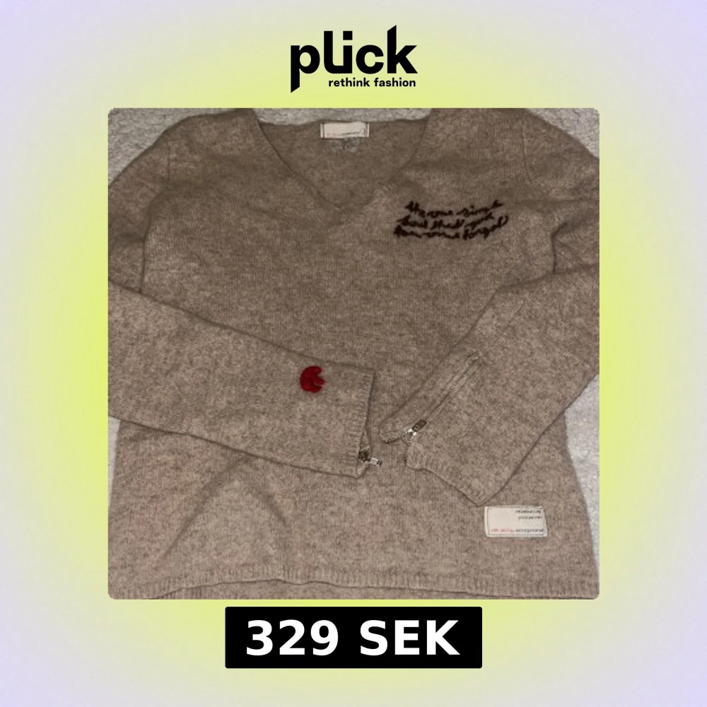 Beige stickad tröja från Odd Molly med v-ringning, broderad text på bröstet och en röd broderad rosett på ärmen. Tröjan har långa ärmar, dragkedja vid ärmslut. Inga defekter 💞
