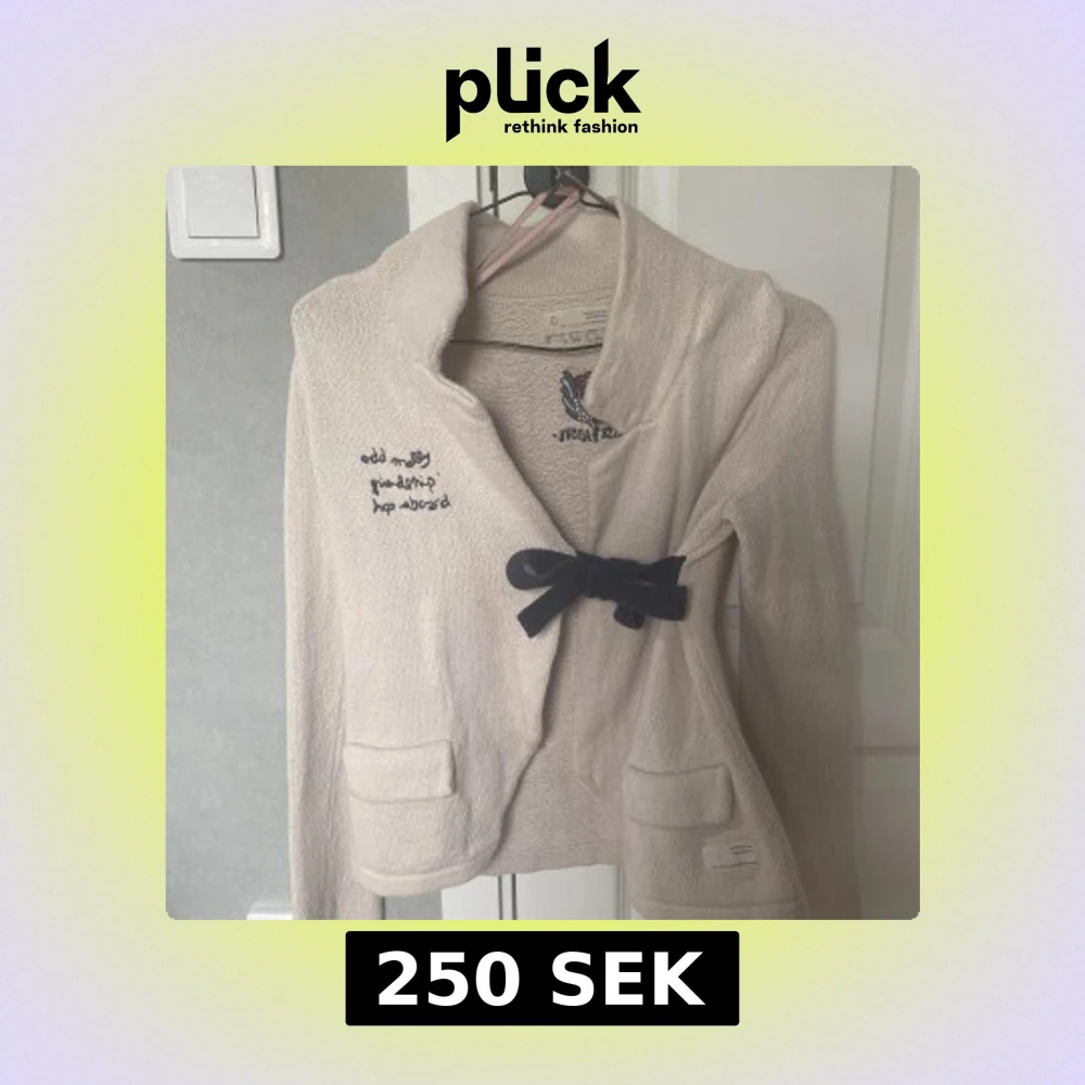 Säljer en beige stickad kofta från Odd Molly med broderad ros och texten 'Rise Above' på bröstet. Koftan har lång ärm, två fickor fram och knytdetalj i midjan. Perfekt för lager-på-lager och snygg till jeans eller kjol.
