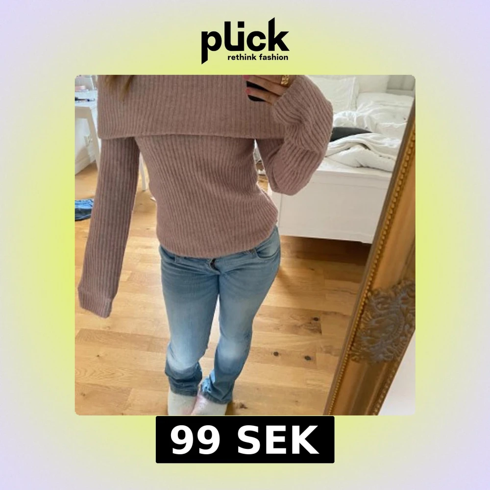 Säljer en snygg beige ribbad tröja med offshoulder-design. Tröjan har långa ärmar och en tight passform som framhäver figuren. nästan helt ny!