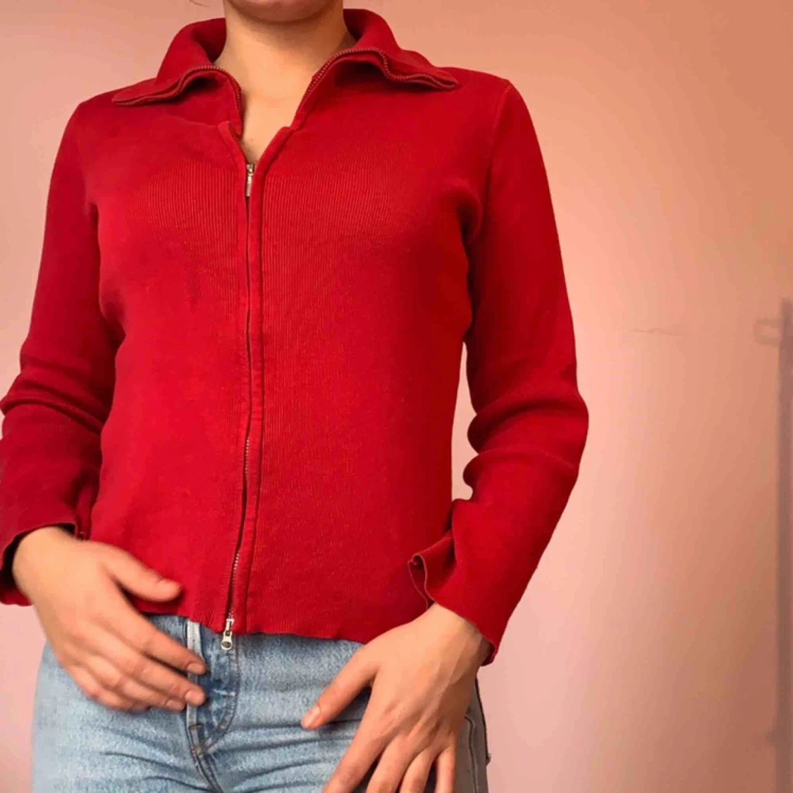 Röd stickad kofta/polo❤️ Går att styla på många olika sätt och är sjukt snygg! Bra skick och kvalitet🥰