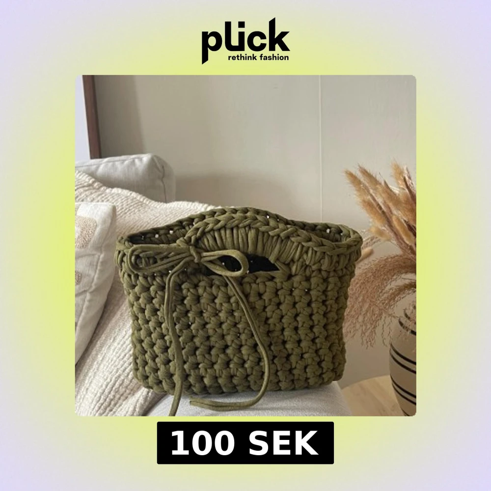 Snygg handväska i olivgrönt, grovstickat material med charmig knytning framtill. Väskan har en mjuk, boxig form och är perfekt för dig som gillar unika accessoarer. Perfekt att bära till vardags för en cool och personlig stil.