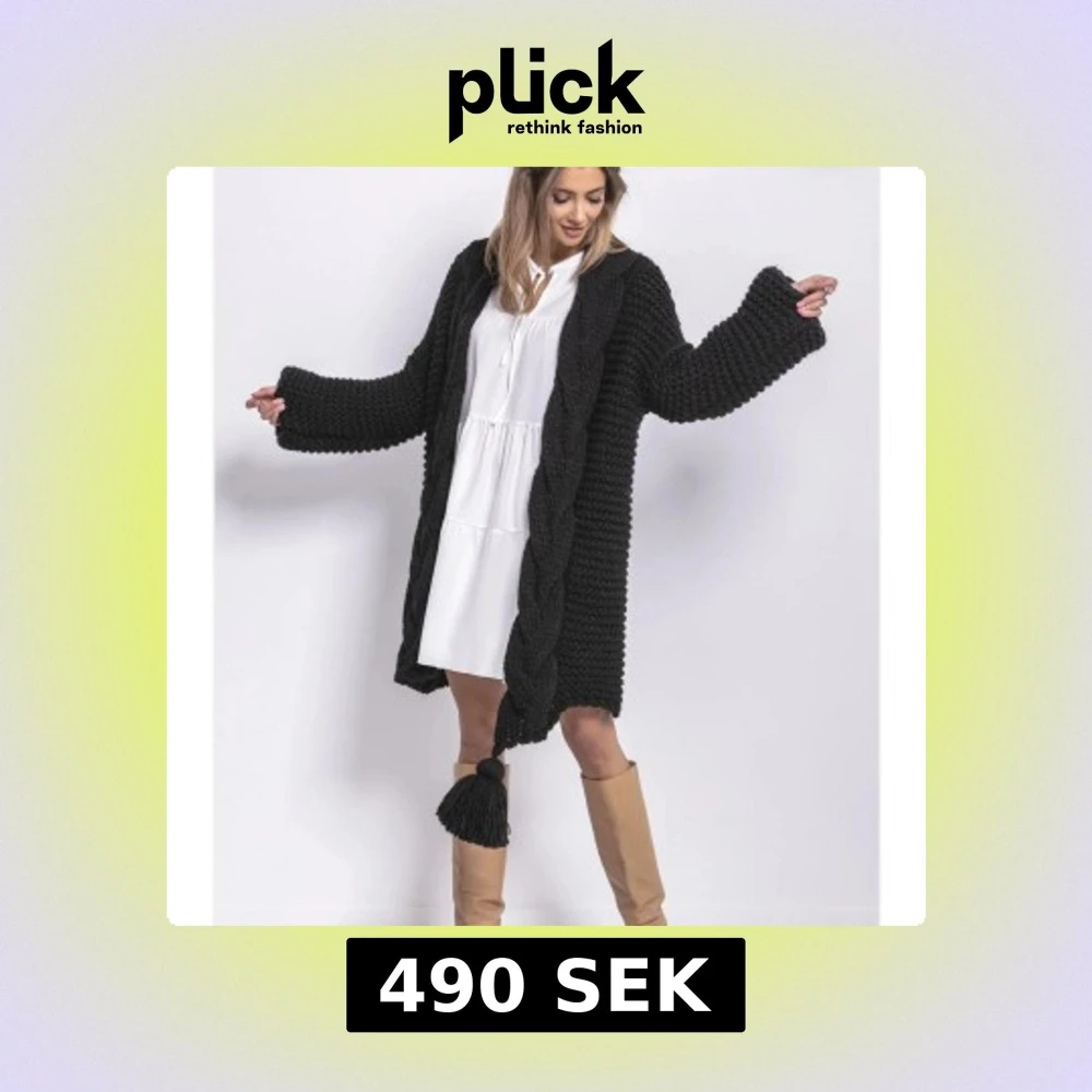 Säljer en mysig svart stickad kofta oversized passform. Koftan har en dekorativ tofsdetalj framtill. Helt ny med lapparna på