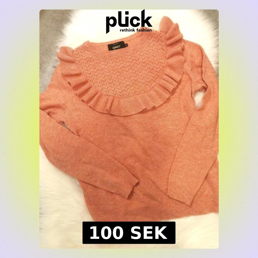 Superfin stickad tröja i persikorosa från ONLY. Tröjan har lång ärm, rund halsringning med spetsstickat mönster och en bred volangdetalj runt halsen. Perfekt för dig som gillar söta detaljer och mjuka material. Den är i fint använt skick, något nopprig. Storlek XS.