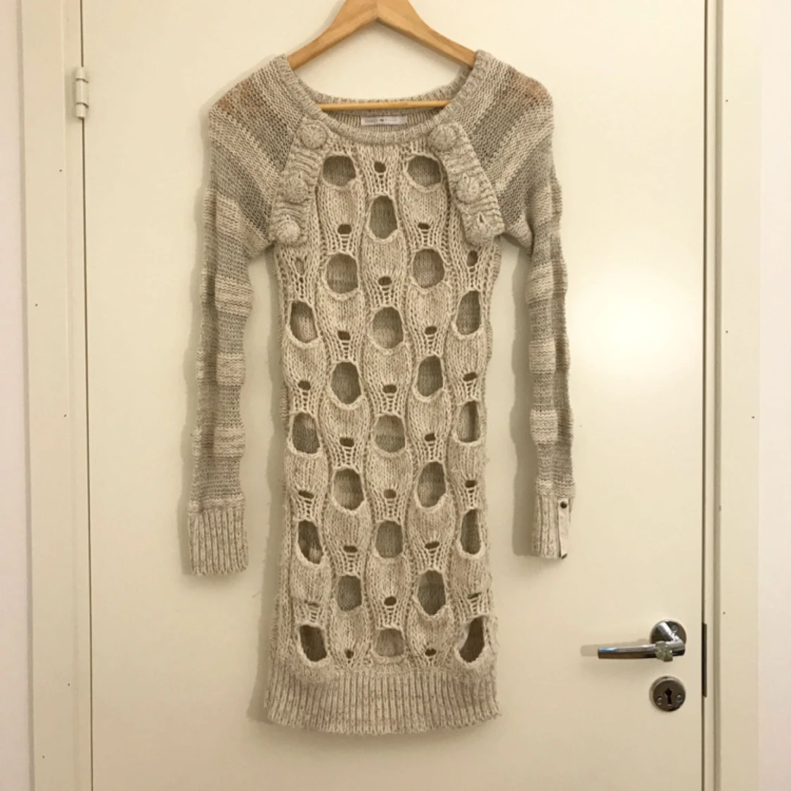 Cool beige stickad tröja från ONLY med hål och knappar som detaljer. Tröjan är i storlek S och kan användas som en tröja eller som en klänning. Nypris 399 kronor men säljes för 50 kronor. Hämtas i Uppsala eller fraktas till önskar adress.