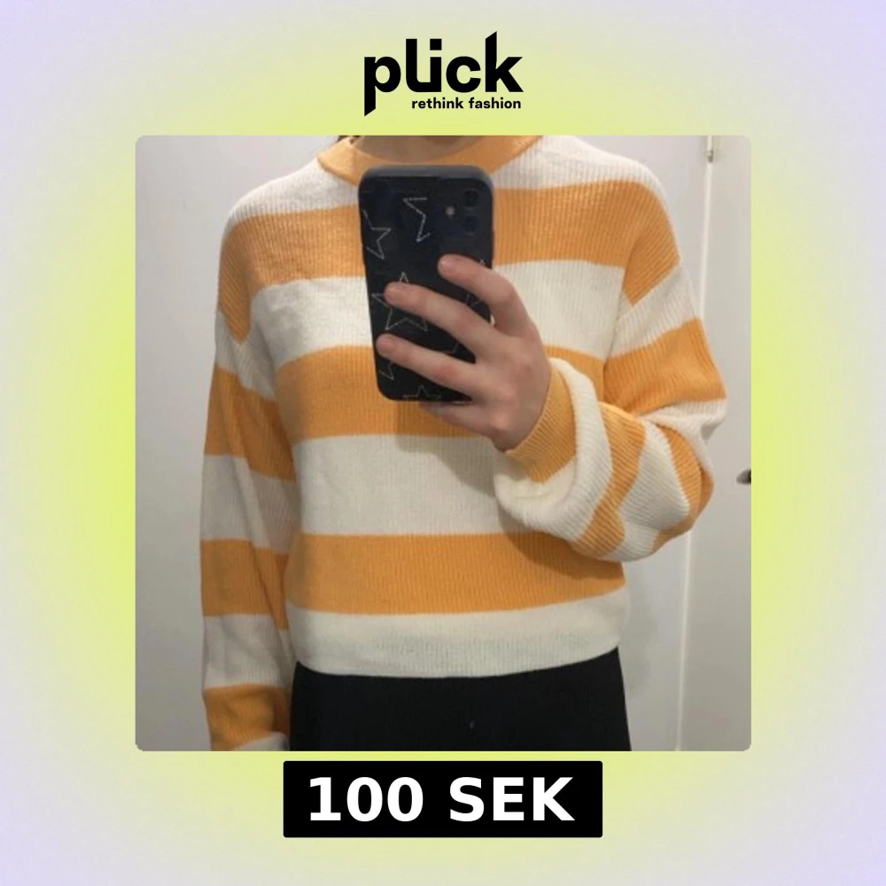 Säljer en superfin randig stickad tröja i orange och vit. Den är perfekt för höst och vår med sina långa ärmar och mjuka material. Tröjan är croppad och har en normal passform. Perfekt för en avslappnad och stilren look!