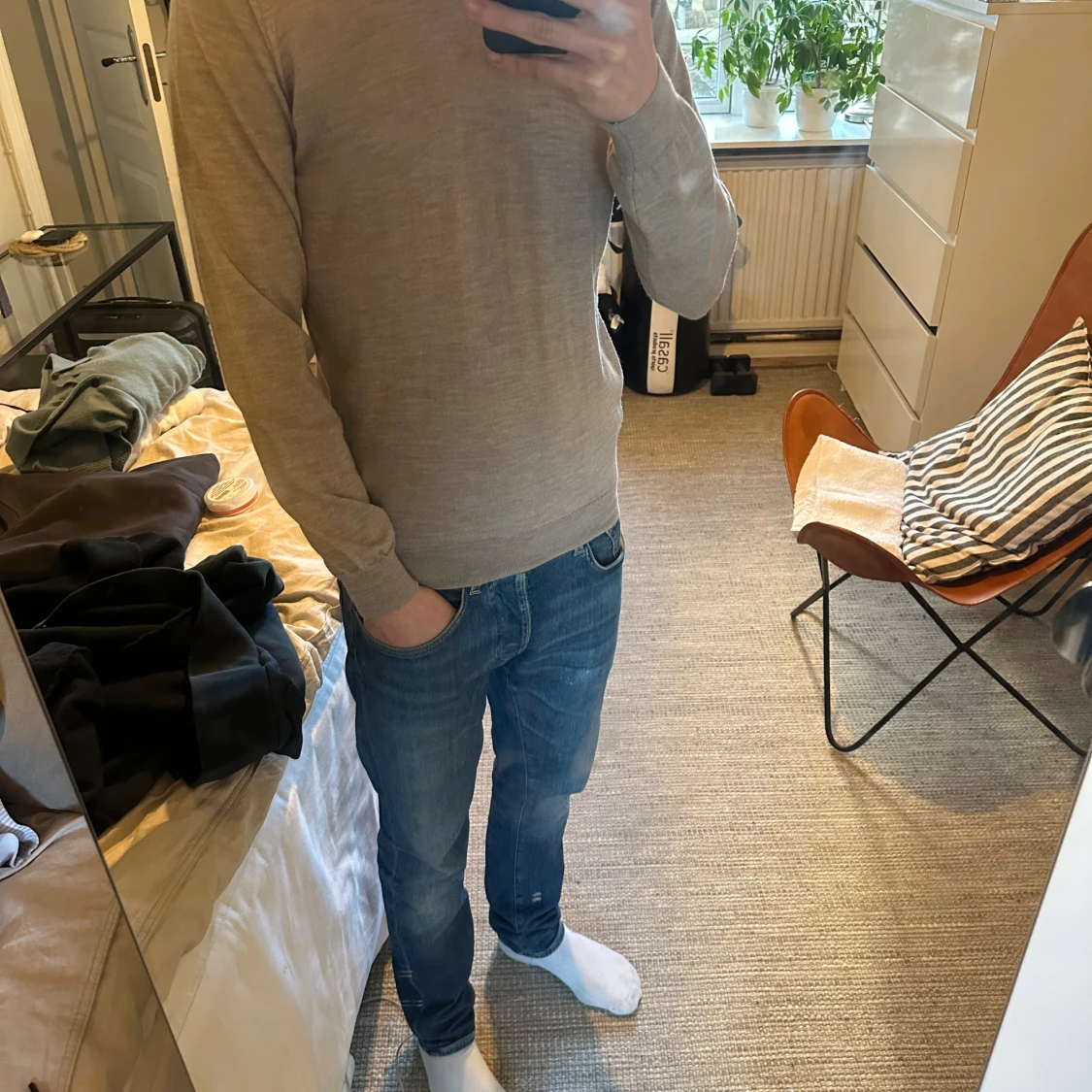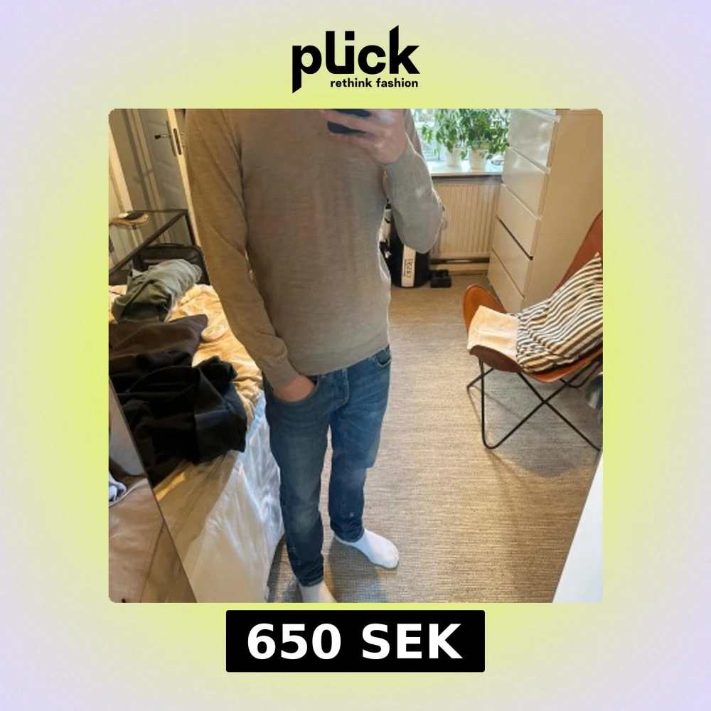 Säljer denna snygga och stilrena Oscar Jacobsson Merino ull tröja i size s