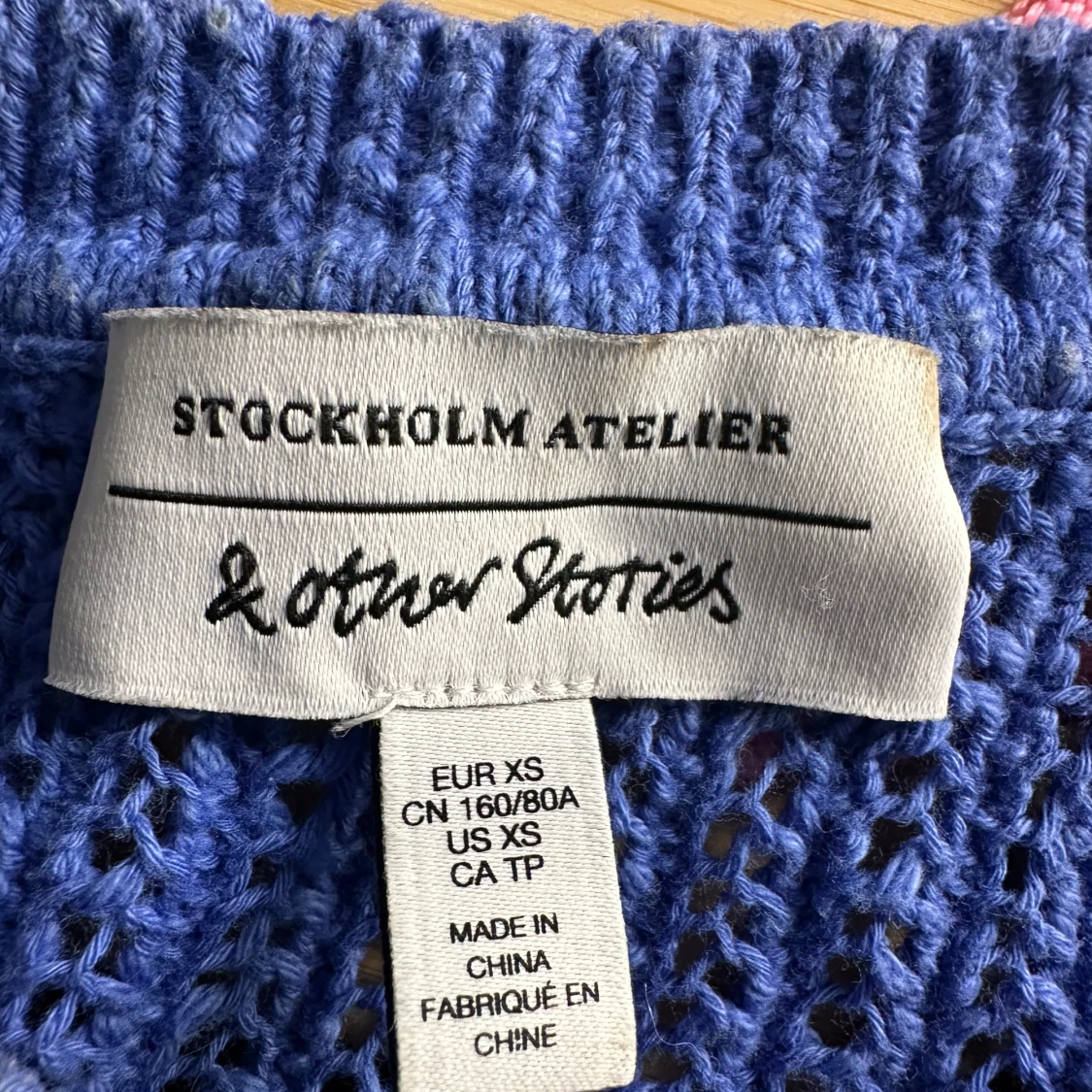 En superfin stickad blå tröja , den e lite ihålig . Säljer pga att den inte kommer till användning längre och den är i superbra skick!!