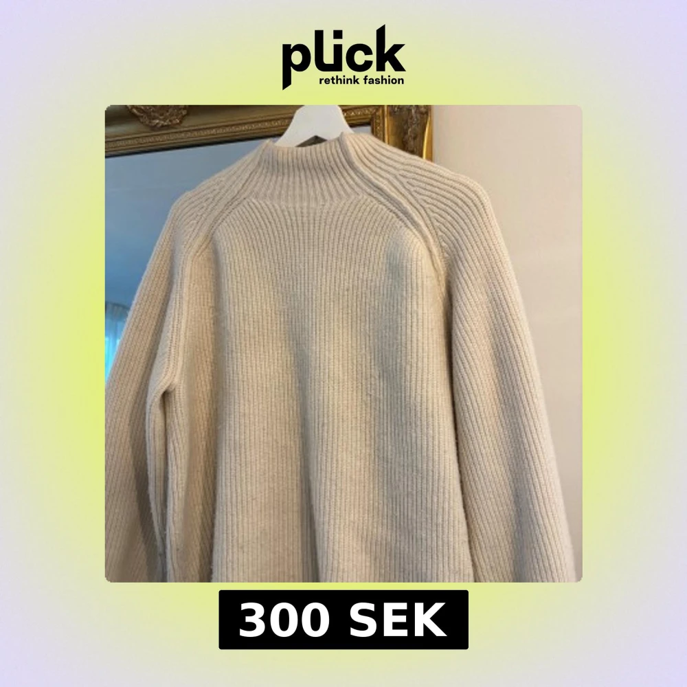 Säljer en beige stickad tröja i storlek S med ribbad struktur och hög hals. Tröjan har långärmade raglanärmar och är perfekt nu till vintern!!💕