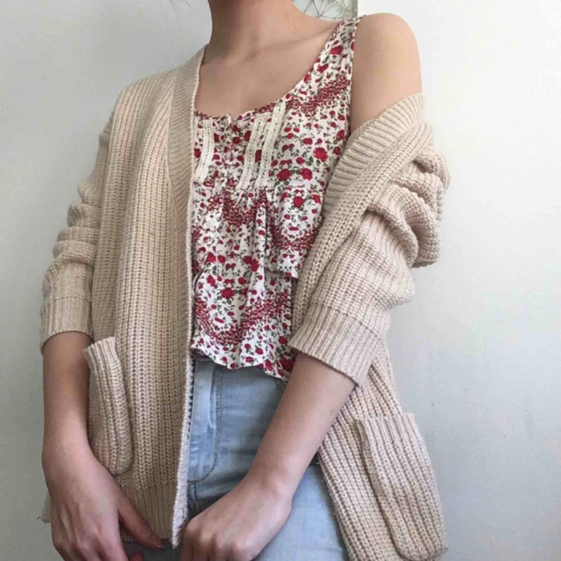 Stickad tröja i vad jag skulle kalla varm beige. Står att det är storlek M, men jag har långa armar så skulle säga att den passar bra som small snarare. Lite nopprig men borde gå att ta bort. Säljs antingen separat, eller tillsammans med toppen för 100kr