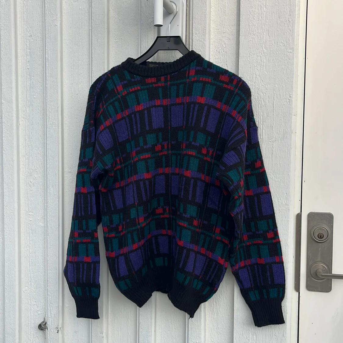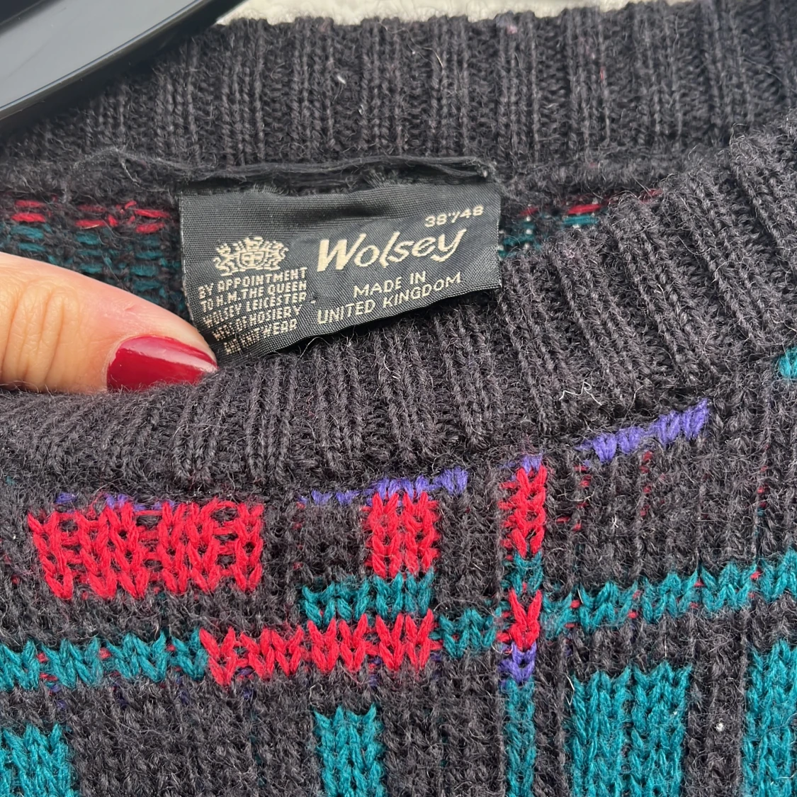 Multifärgad stickad tröja från märket Woolsey i storlek M. Tröjan är Oversized i modellen så den passar också L. Köpt second hand på Beyond Retro. Säljer då den inte kommer till användning