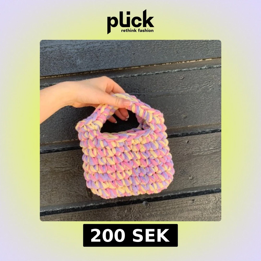 Liten Handvirkad väska med chunky flätad look. Väskan har pastelliga färger i lila, rosa och gul, och ett mjukt handtag som gör den enkel att bära. Perfekt accessoar för att liva upp din outfit!