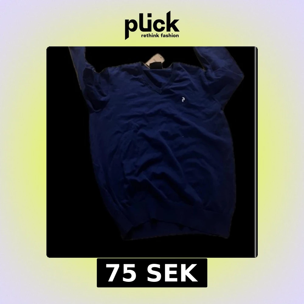 Säljer en blå stickad tröja från Peak Performance med v-ringad hals och diskret logga på bröstet. Tröjan har långa ärmar och ribbade muddar vid ärmslut och nederkant. Perfekt för lager-på-lager under kyliga dagar.