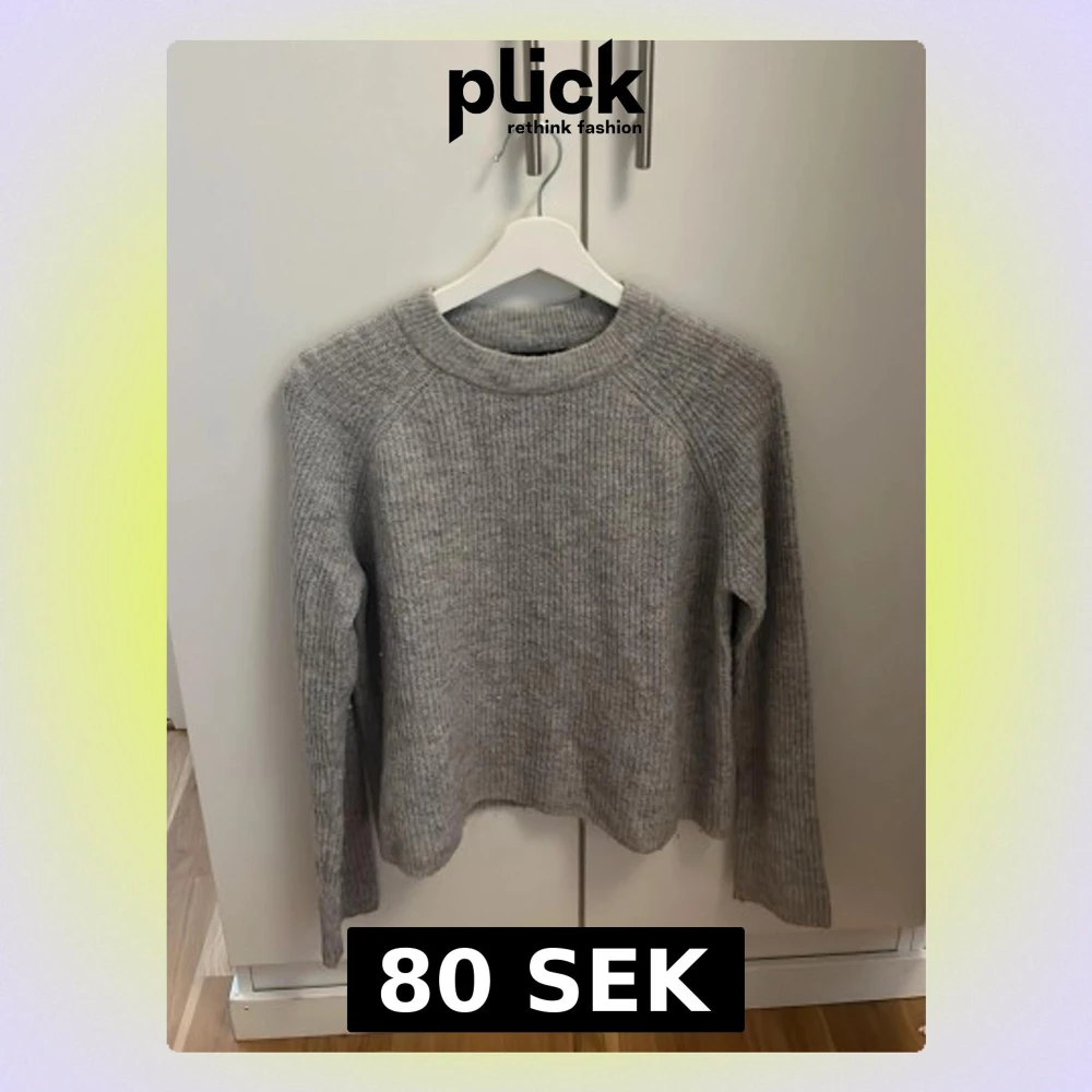 Mysig grå stickad tröja från Pieces med rund halsringning och ribbstickad struktur. Tröjan har långa ärmar och en avslappnad passform, perfekt för kyliga dagar. Enkel och stilren design som passar till det mesta. Har en liten fläck vid halsen