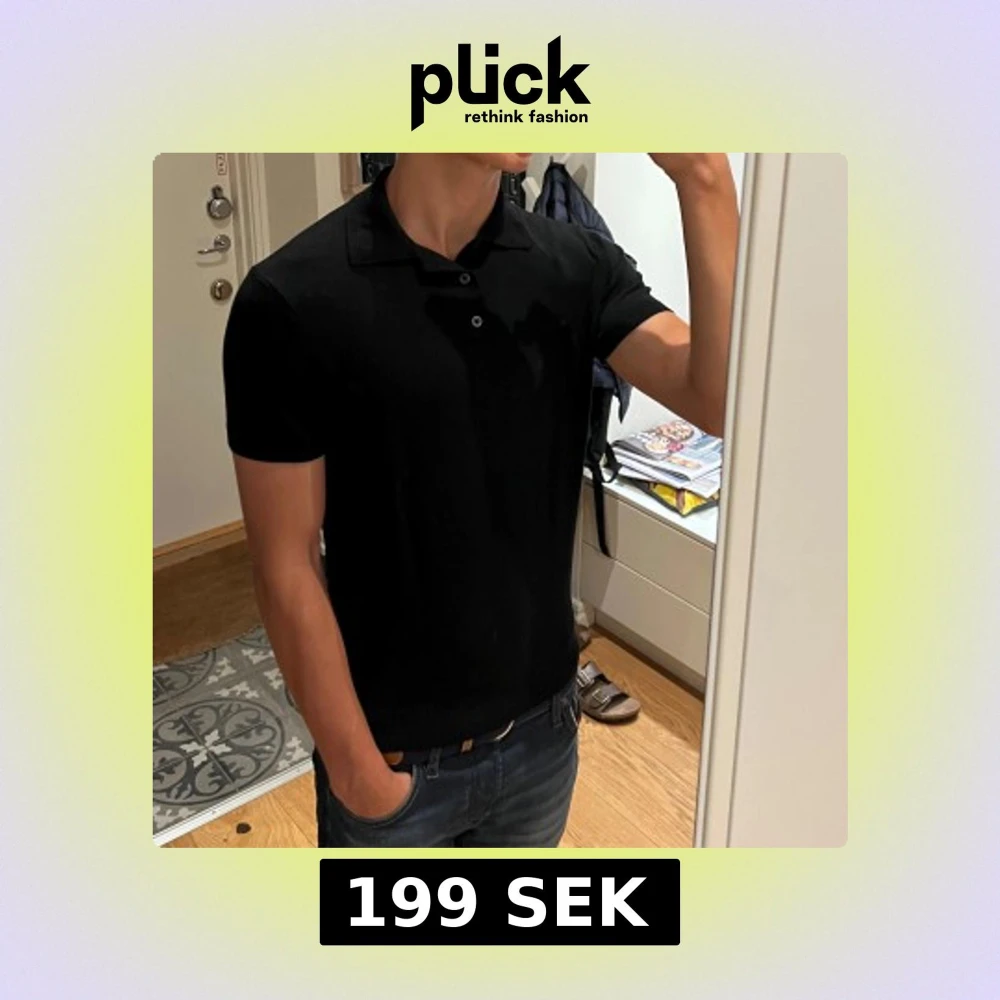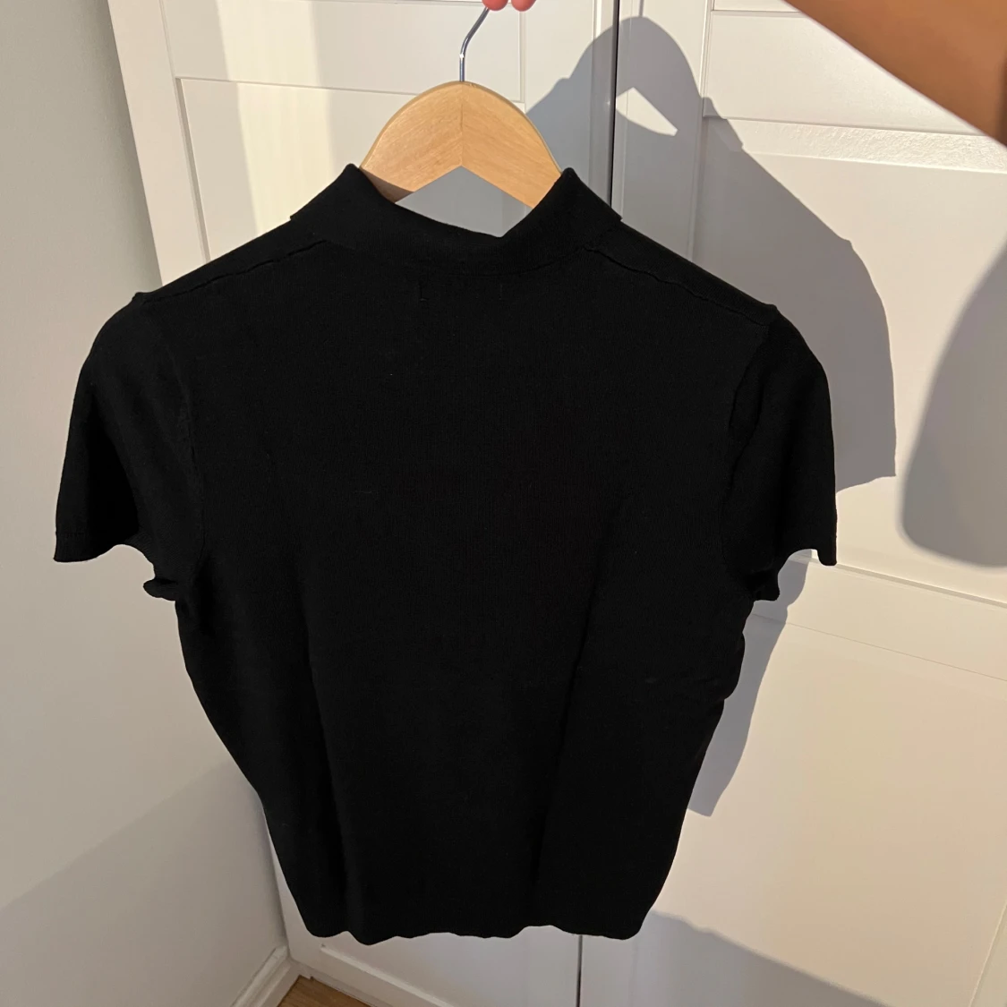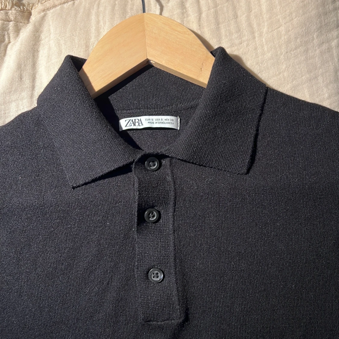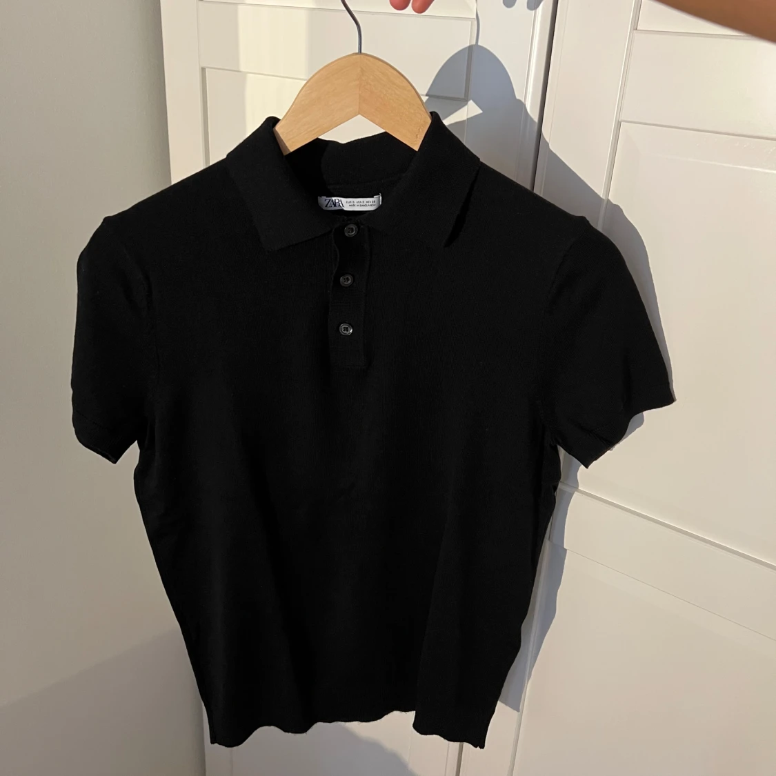 Svart stickad piké från Zara med klassisk krage och tre knappar framtill. Storlek s men jag skulle snarare säga att den sitter xs. Materialet är väldigt mjukt och gjort utav viskos bambu. Skriv om du har frågor🤗