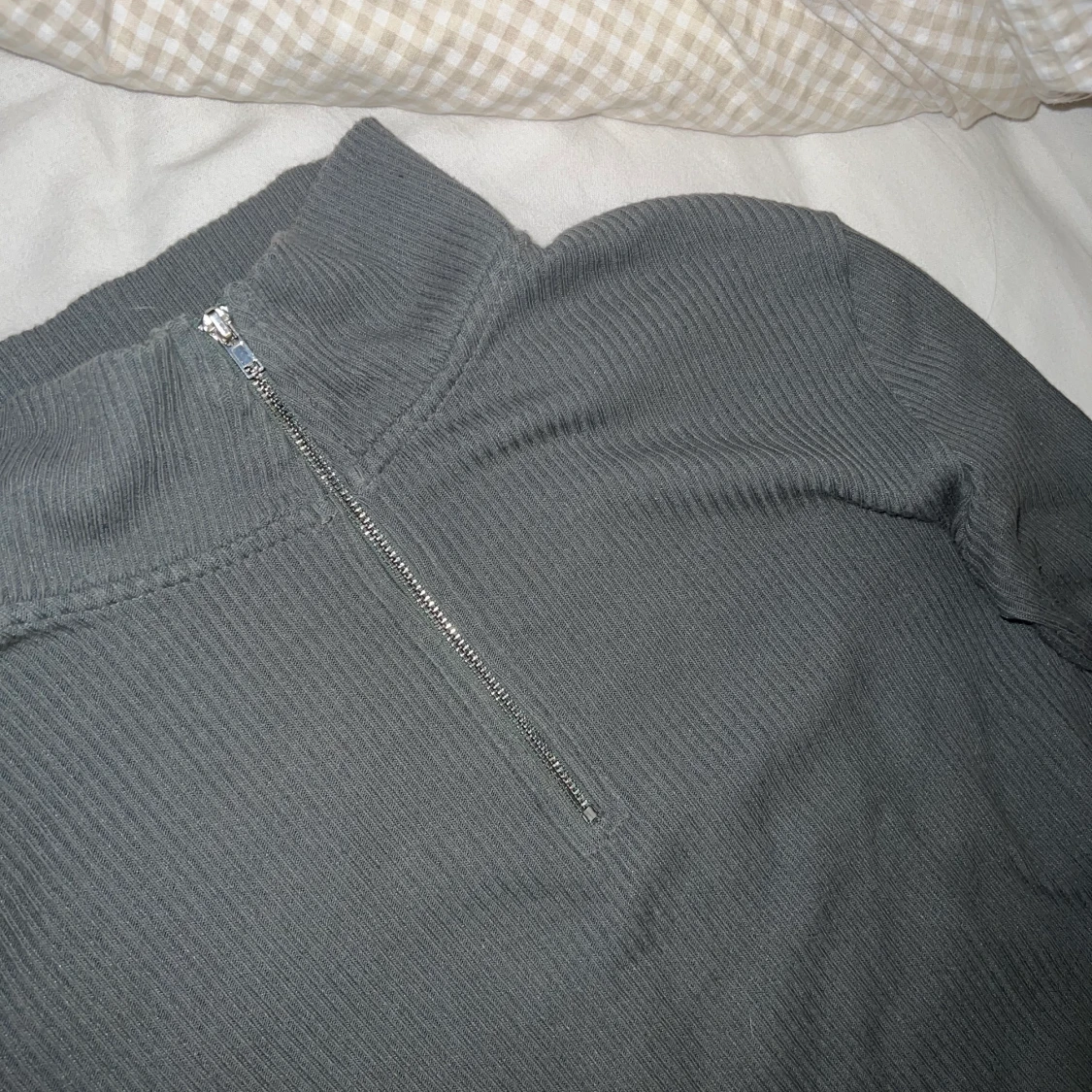 Grön snygg stickad tröja med dragkedja i väldigt bra skick! Storlek S Första bilden är lånad, färgen är svår att få upp på bild men är mest lik bild 2 (lite grönare)