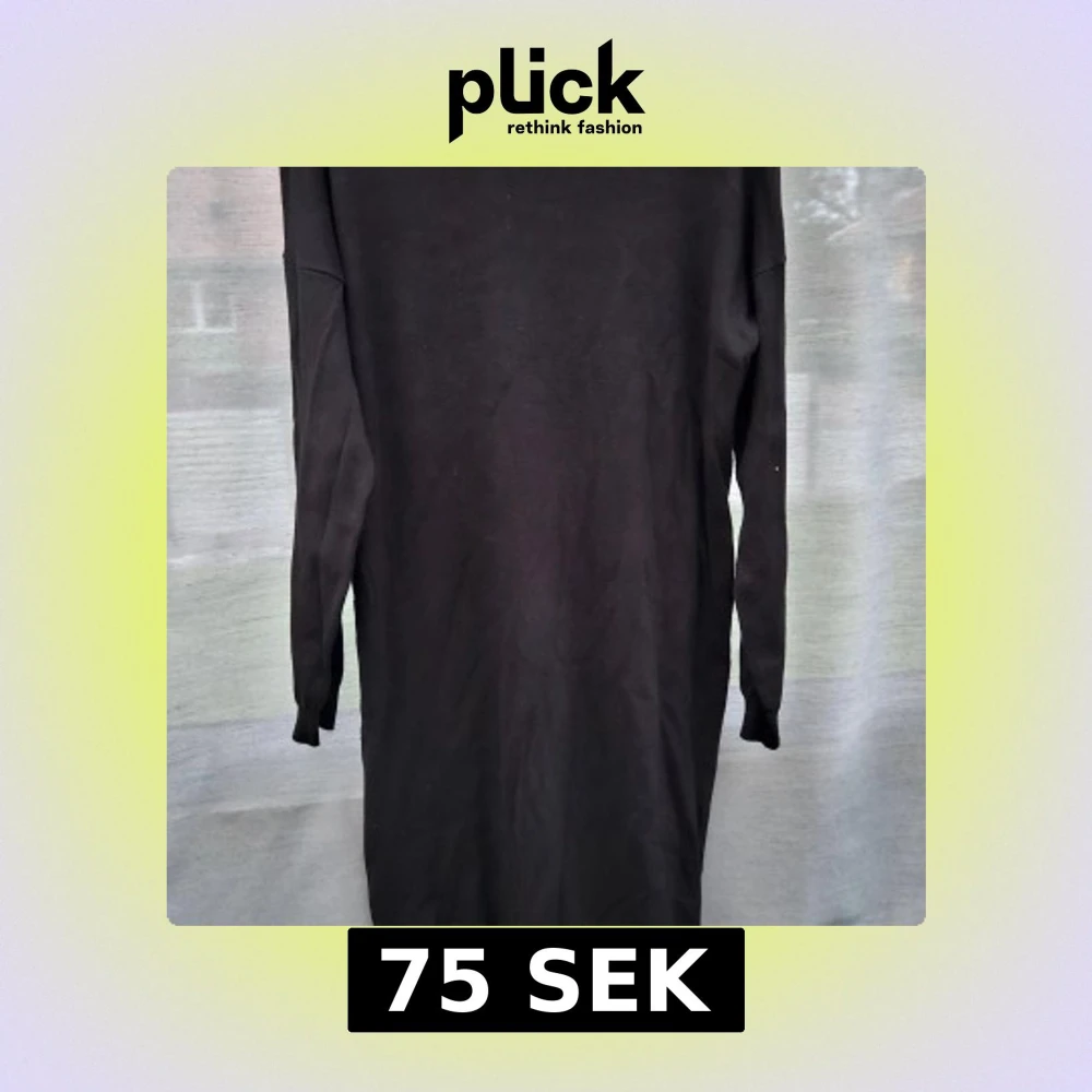 En svart långklänning i stickat material med långa ärmar och ribbade muddar. Enkel och stilren design som passar perfekt till kyligare dagar. Klänningen har en rak passform och är mjuk och bekväm att bära. Klänningen har ett sprund I båda dimmorna. Inte så tjock.Djur och rökfritt hem mycket fint. Nylon o viskos