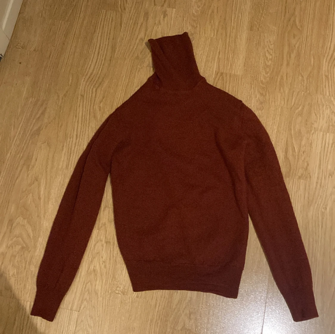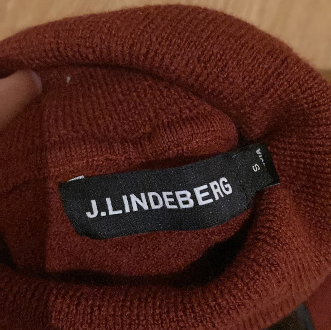 Det är en stickad polo-tröja från J.Lindeberg. Den är vinröd. Tröjan är i storlek S.
