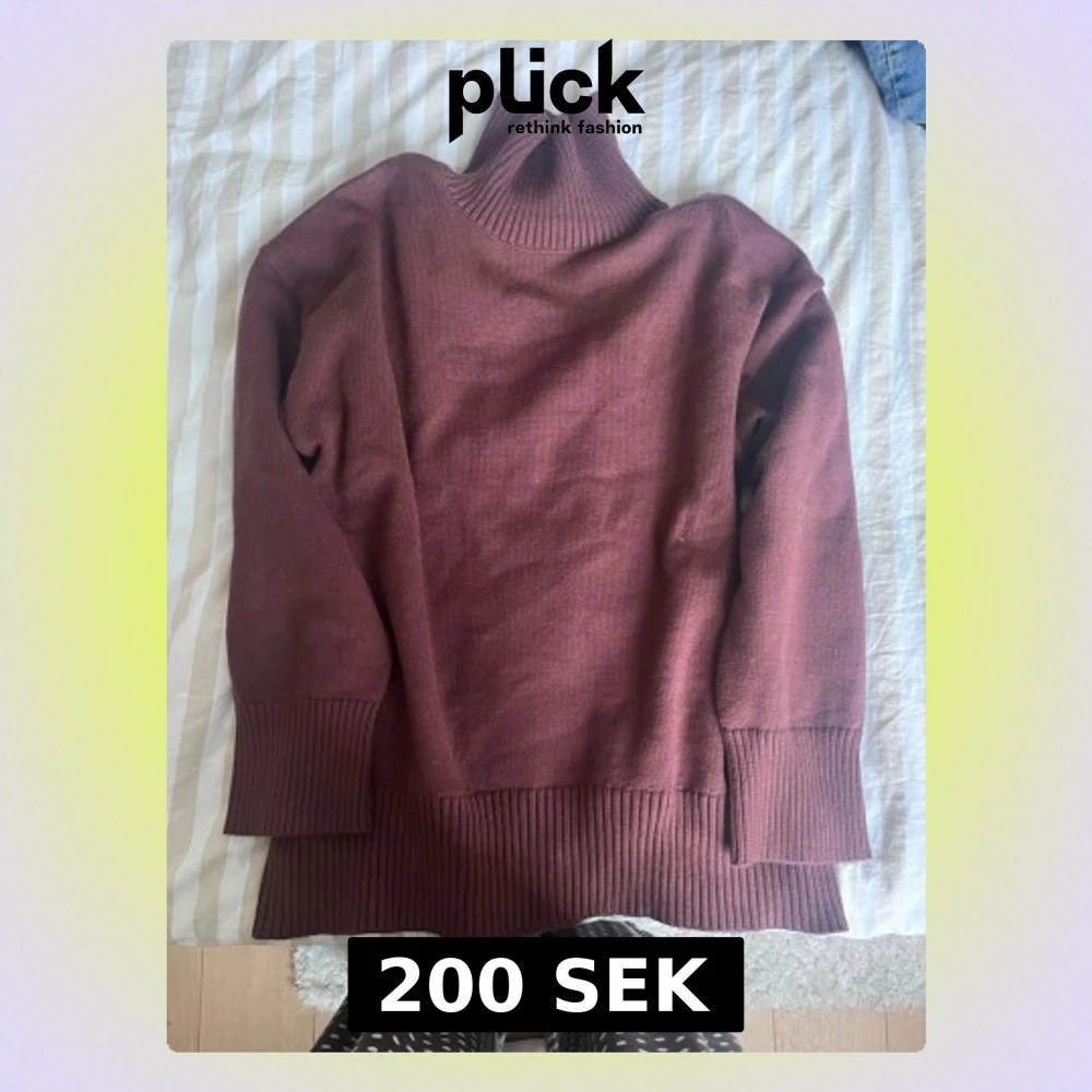 Mysig stickad polotröja i en djup brun färg. Tröjan har breda ribbstickade muddar vid ärmslut och nederkant samt en hög polokrage som ger extra värme. Perfekt för kyliga dagar och enkel att styla till olika outfits.
