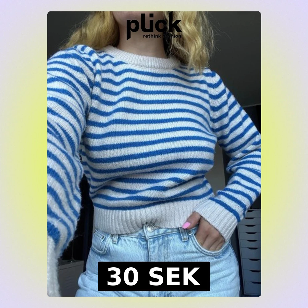 En blå/beige randig stickad tröja med ribbade muddar. Vet ej storlek med den sitter som en S/M skulle jag säga. Varm och skön! Bra skick!