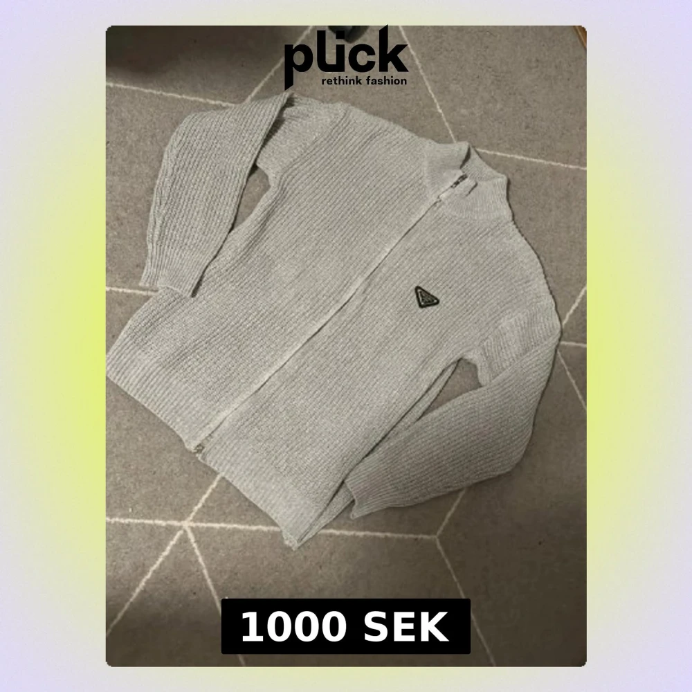 Snygg grå stickad ziptröja från Prada med hög krage och ikonisk trekantslogga på bröstet. Tröjan har grovstickad struktur, långa ärmar och dragkedja framtill. Perfekt för lager-på-lager och en clean look.
