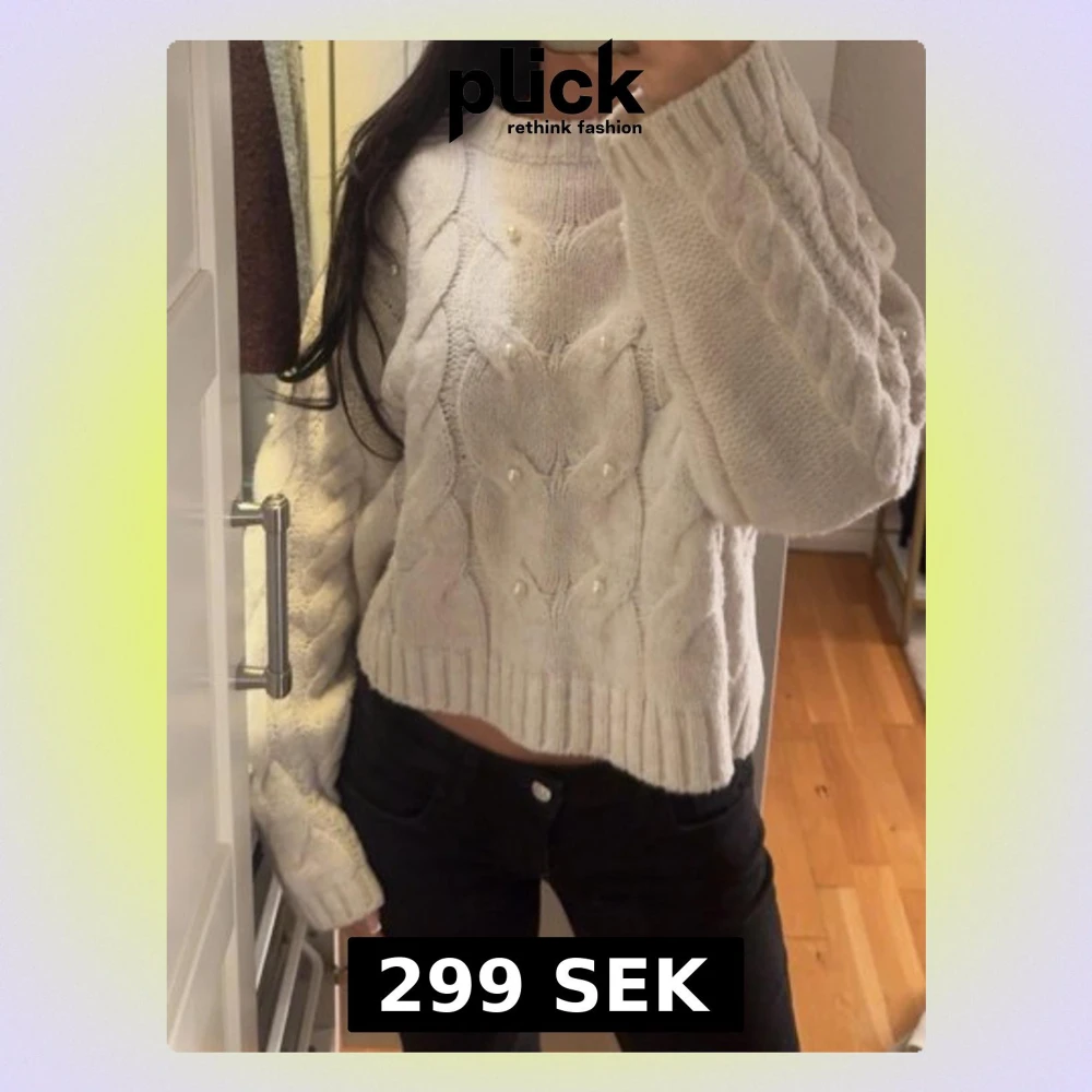Superfin vit kabelstickad tröja med pärldetaljer på framsidan. Tröjan har en boxy, croppad passform och breda ärmar med ribbade muddar. Perfekt för att hålla sig varm och snygg under kyliga dagar.