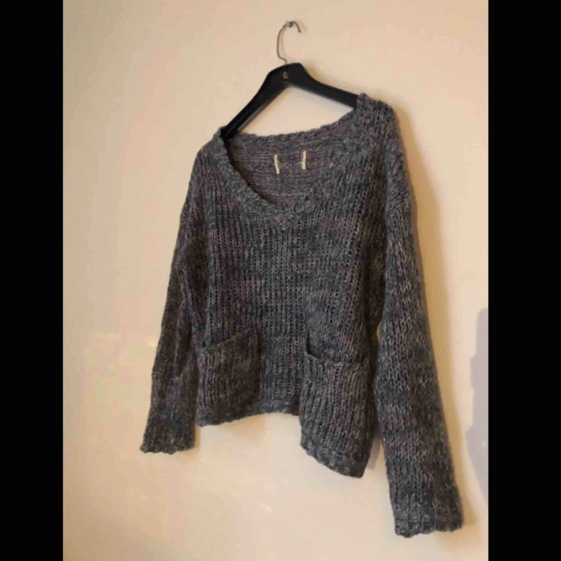 Stickad blå tröja med fickor på framsidan. Lappen bortklippt men knappt använd. Köparen står för frakt:)